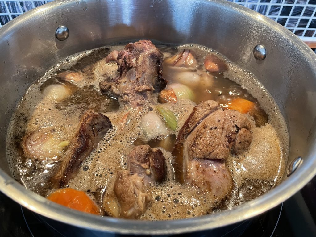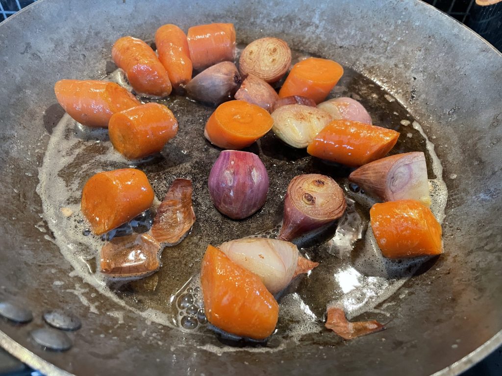 Så til å lage selve kraften. Steik beina i en jernpanne (helst) i smør på god varme til de er fint karamellisert. Ha beina over i en ny gryte og kok ut steikepanna med ca 1/2 liter vann, og bruk en visp for å få ut alt av panna. Hell over kjøttet. Gjør det samme med 2 store gulrøtter kuttet i skiver, og en 4-5 sjalottløk i grove biter. På sjalottløken tar jeg av det ytterste løse laget med skall, og kutter av roten. Resten er på – setter farge på krafta. Også her koker du ut med 1/2 liter vann og har over kjøttet i panna. Tilsett vann slik at du såvidt dekker det meste av kjøttet – her brukte jeg totalt 1 1/2 liter vann. Krafta kokes under lokk (putrer så vidt) – gjerne i 2-3 timer. Sil kraften, ha den over i en ny kasserolle og kok inn/reduser til ca halv mengde. Nå har du en lammekraft som er veldig smaksrik, og ja… Du kan sikkert drikke den som den er :-). Sett kraften til side – den skal du bruke i sausen senere.