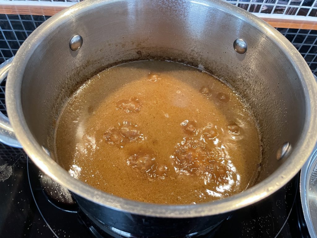 Når vi kommer til dette punktet så har lammelåret kommet opp i 67 grader hos meg. Da har jeg i tillegg planlagt måltidet slik at ertestuingen er ferdig kokt, og står på platetoppen med lokk på for å holde varmen. Sausebruningen er ferdig laga.