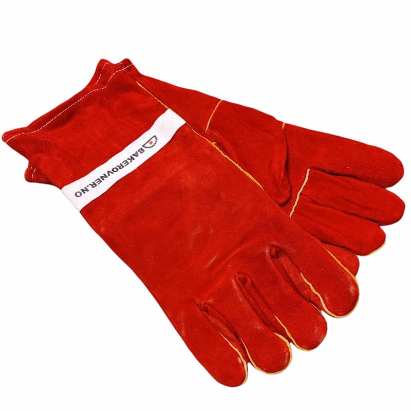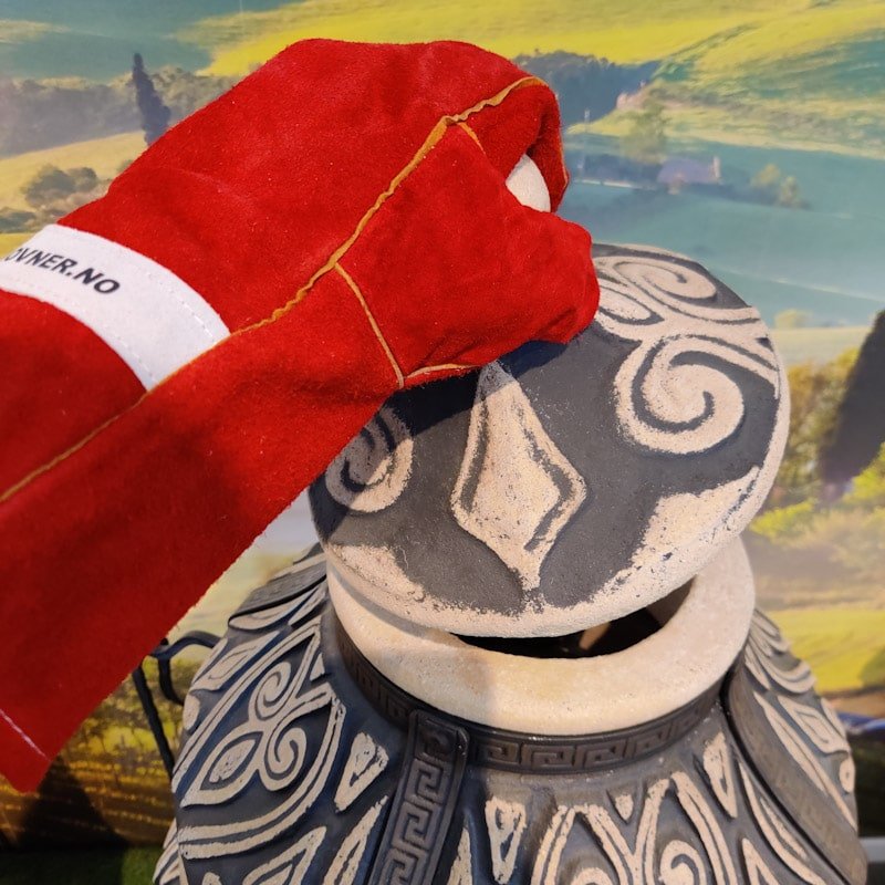 Ovnshansker som holder hendene kalde mens du setter inn mer ved i ovnen, tar på varme deler av ovnen eller løfter ut og inn grillristen, støpejernspanna og annet.